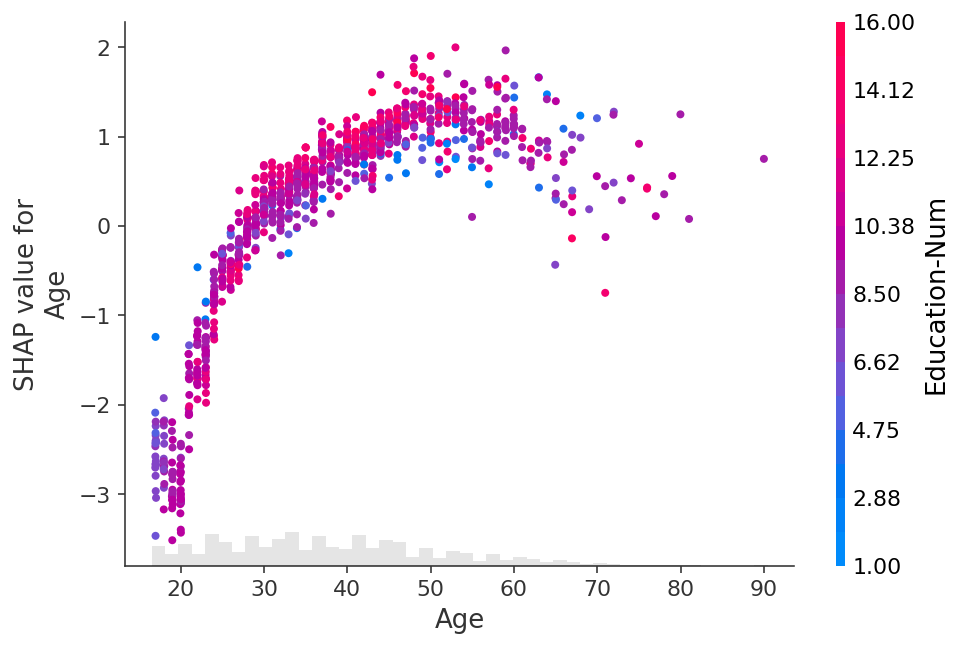 shap.plots.scatter(shap_values[:, "Age"], color=shap_values)