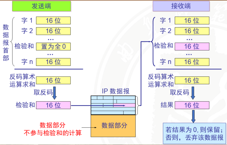发送端先计算校验和,并把得到的结果与数据包一起发送出去。接收端对数据包进行同样的计算。若结果正确,则接受这个数据包,否则就丢弃它。