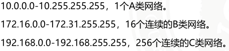 专用lIP地址:仅用于专用网内部的本地主机。 大多数路由器不转发携带专用IP地址的数据包,本地主机必须经网络地址转换服务器才能访问Internet。 专用IP地址范围: