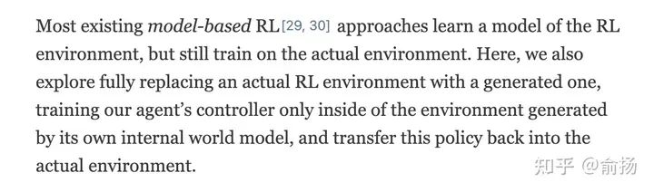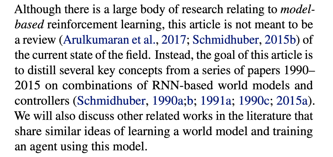 Jurgen的这篇论文属于强化学习领域。那么,强化学习里不是有很多model-based RL吗,其中的model跟world model有什么区别?答案是没有区别,就是同一个东西。Jurgen先说了一段: