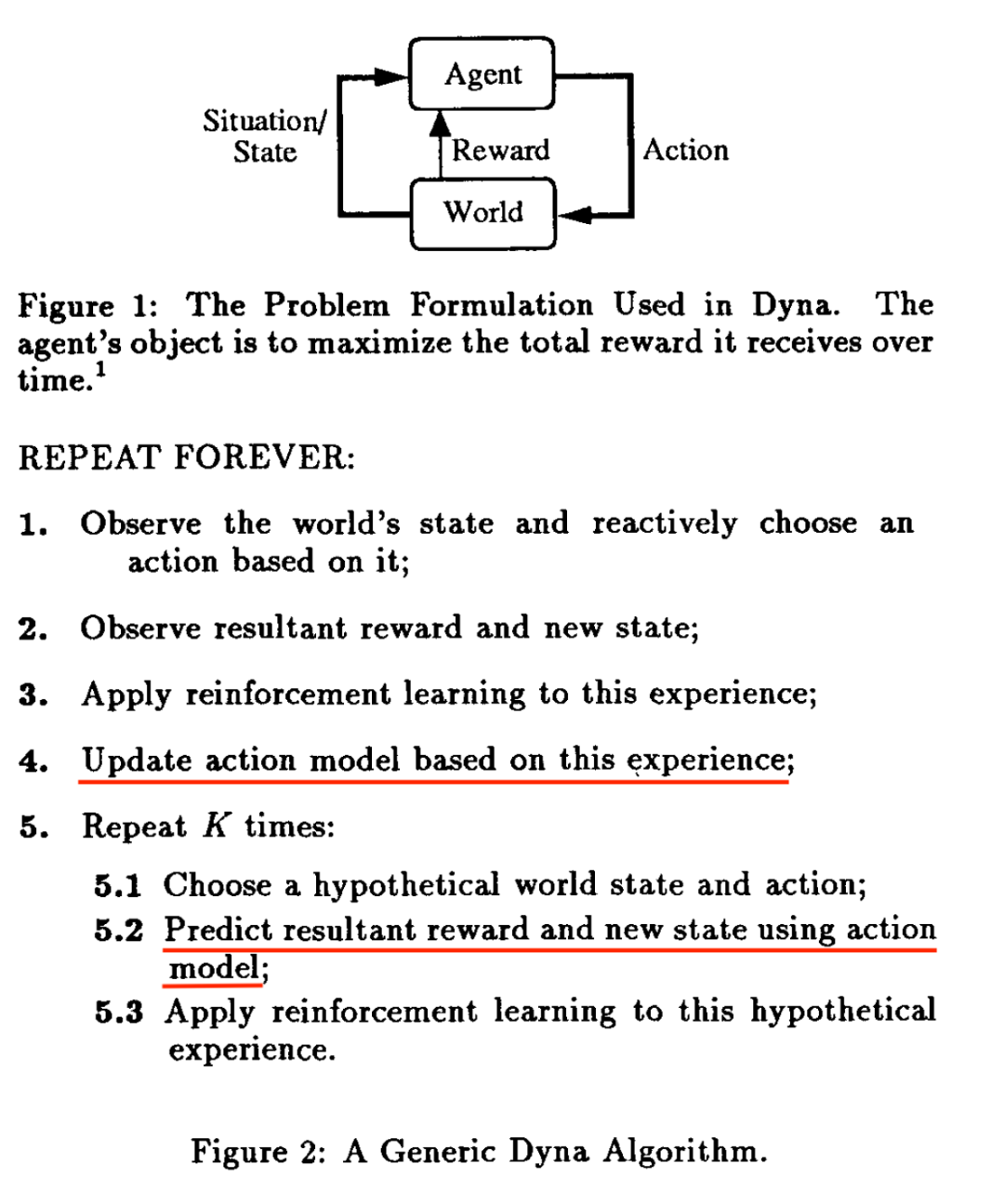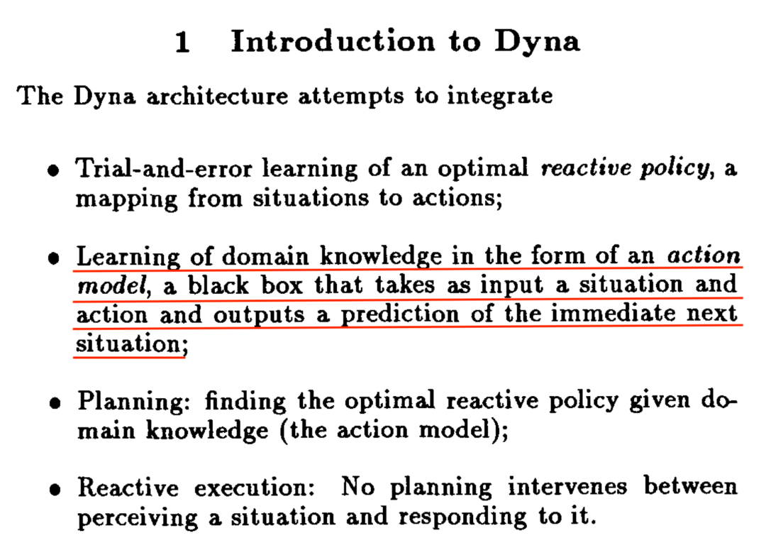 聪明的Sutton在很久以前就意识到model不够准确的问题。在1990年提出Dyna框架的论文 Integrated Architectures for Learning, Planning and Reacting based on Dynamic Programming(发表在第一次从workshop变成conference的ICML上),管这个 model 叫 action model,强调预测action执行的结果。RL一边从真实数据中学习(第3行),一边从model中学习(第5行),以防model不准确造成策略学不好。
