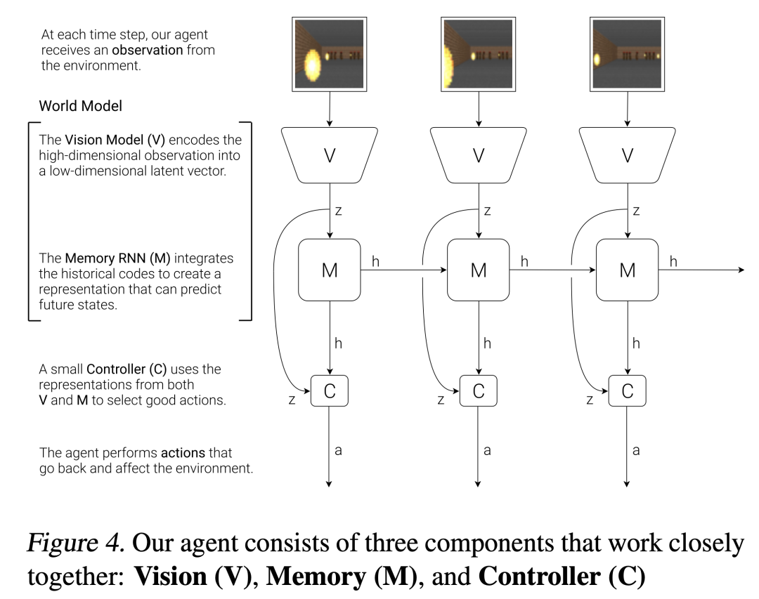 图中纵向V->z是观测的低维表征,用VAE实现,水平的M->h->M->h是序列的预测下一个时刻的表征,用RNN实现,这两部分加起来就是World Model。