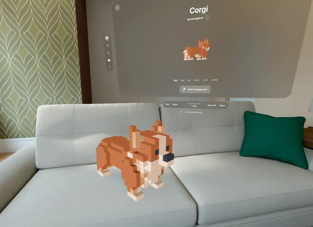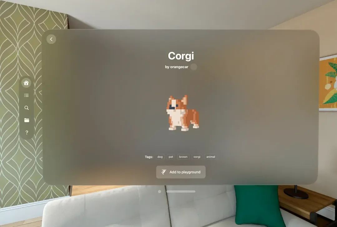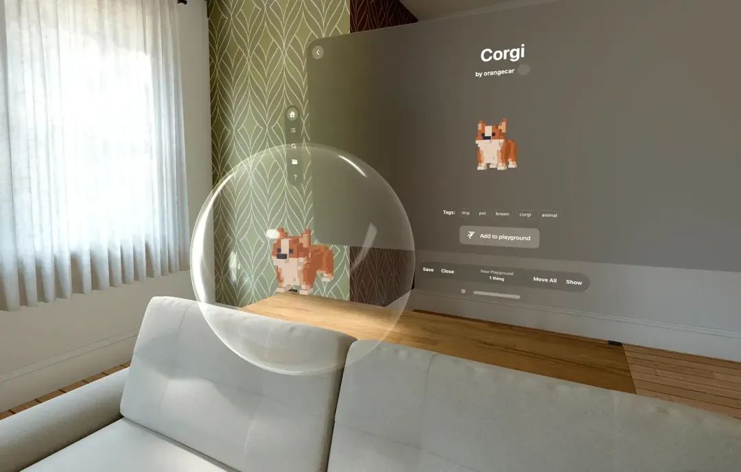 现在,你可以点击“添加到游乐场”,然后你的柯基犬会进入一个气泡里供你操作(否则这些对象该怎么用呢?),你可以把它放在你家中的任何地方,或者公园、办公室都行。