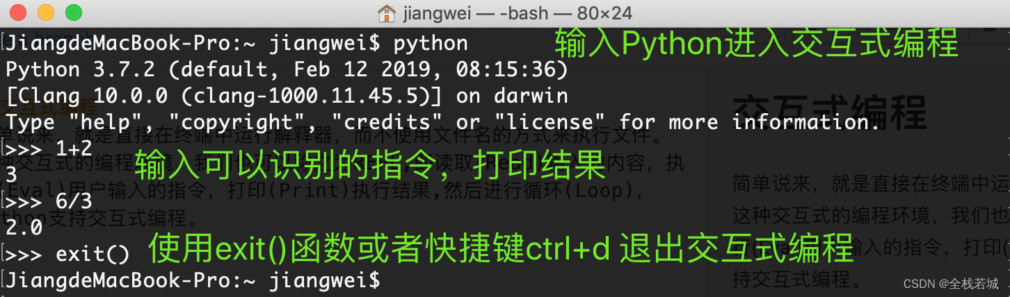 简单说来,就是直接在终端中运行解释器,而不使用文件名的方式来执行文件。这种交互式的编程环境,我们也可以称之为REPL,即读取(Read)输入的内容,执行(Eval)用户输入的指令,打印(Print)执行结果,然后进行循环(Loop),Python支持交互式编程。