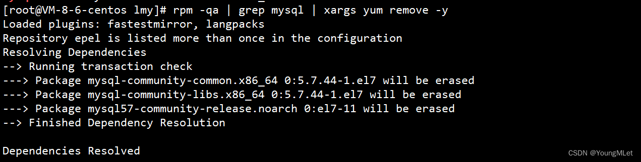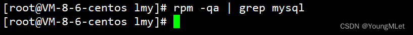 如上,我们的机器上是有 mysql 的系统安装包的,所以我们先开始卸载这些安装包,其指令为:rpm -qa | grep mysql | xargs yum remove -y,由于我们现在是 root 用户,所以不用 sudo 权限,执行如下: