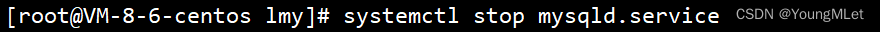 所以我们先卸载我的机器上的 mysql ,在卸载之前我们先把 mysql 的服务停止,其中 mysql 的服务器为 mysqld,所以我们先把 mysqld 停止服务,指令为:systemctl stop mysqld.service,如下:
