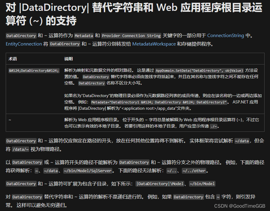 官方文档地址:对 |DataDirectory| 替代字符串和 Web 应用程序根目录运算符 (~) 的支持