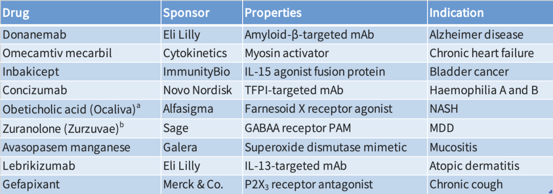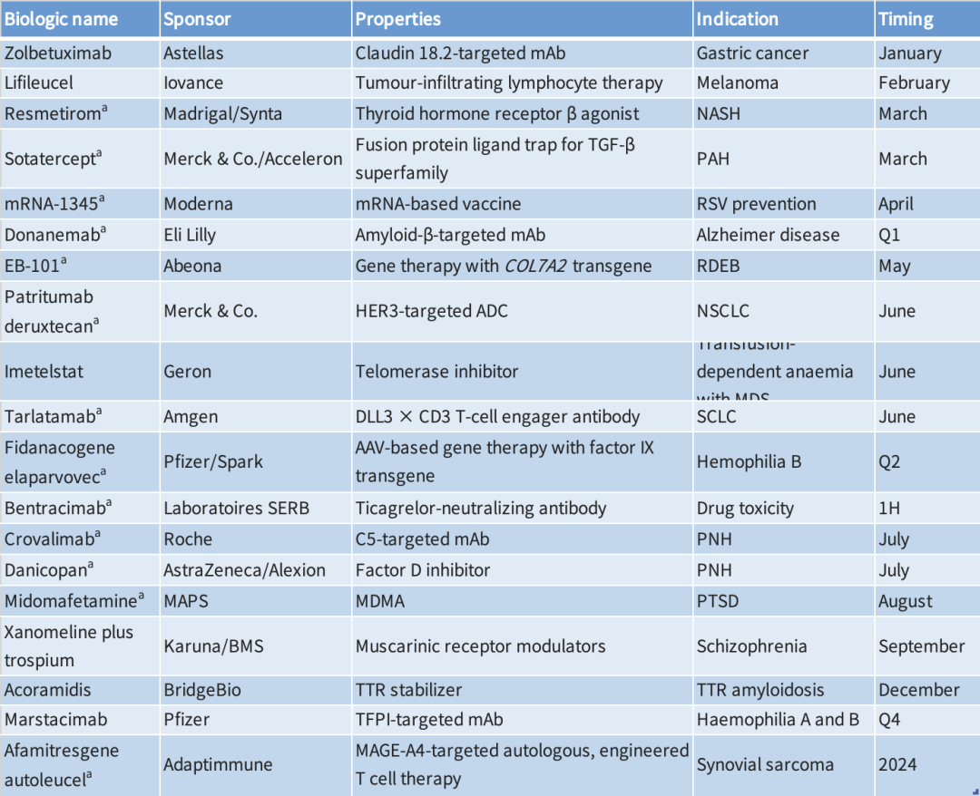 安斯泰来的Zolbetuximab可以为转移性胃癌提供一种急需的治疗方法。Madrigal的甲状腺激素受体β激动剂resmetirom可能成为治疗非酒精性脂肪性肝炎(NASH)的第一种疗法。Moderna的RSV疫苗mRNA-1345如果获得批准,将表明mRNA疫苗平台在COVID-19之外还有更大的潜力。