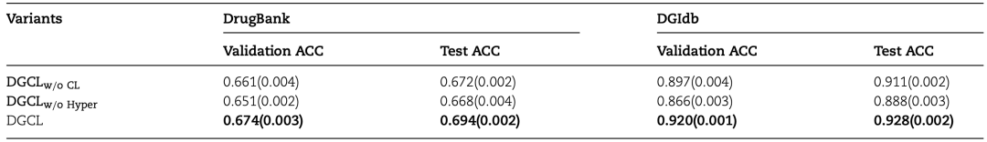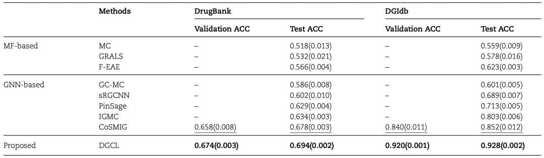 作者将DGCL与一些具有代表性的方法进行了比较,如表1所示。在DrugBank和DGIdb这两个数据集上,DGCL的准确度均超越了现有方法,且显著超过了次优的方法CoSMIG。