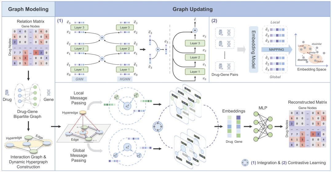 在图1中,左边描述了交互图和动态超图的构建过程。黑色实线表示成对边,它只能连接两个节点。黄色圆角矩形表示超边缘,它能够连接两个或多个节点。在右边,每个节点通过对边(黑色实线)的本地消息传递(紫色虚线)与其邻居消息传递。此外,远程信息通过利用超边(黄色节点)作为中介,通过全局消息传递(虚线)进行传播。然后,通过(1)集成和(2)对比学习组件来桥接来自GNN和HGNN每层的嵌入。最终的药物/基因嵌入集合了局部信息和非局部信息,通过多层感知器(MLP)预测给定药物/基因对的相互作用类型。