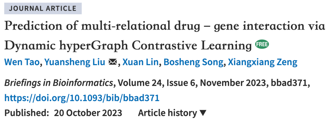 2023年10月20日,湖南大学曾湘祥教授、刘元盛老师团队在Briefings in Bioinformatics上发表文章Prediction of multi-relational drug–gene interaction via Dynamic hyperGraph Contrastive Learning。