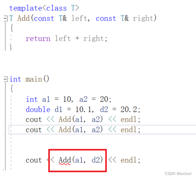 Add(1, 2.0); // 模板函数可以生成更加匹配的版本,编译器根据实参生成更加匹配的Add函数
