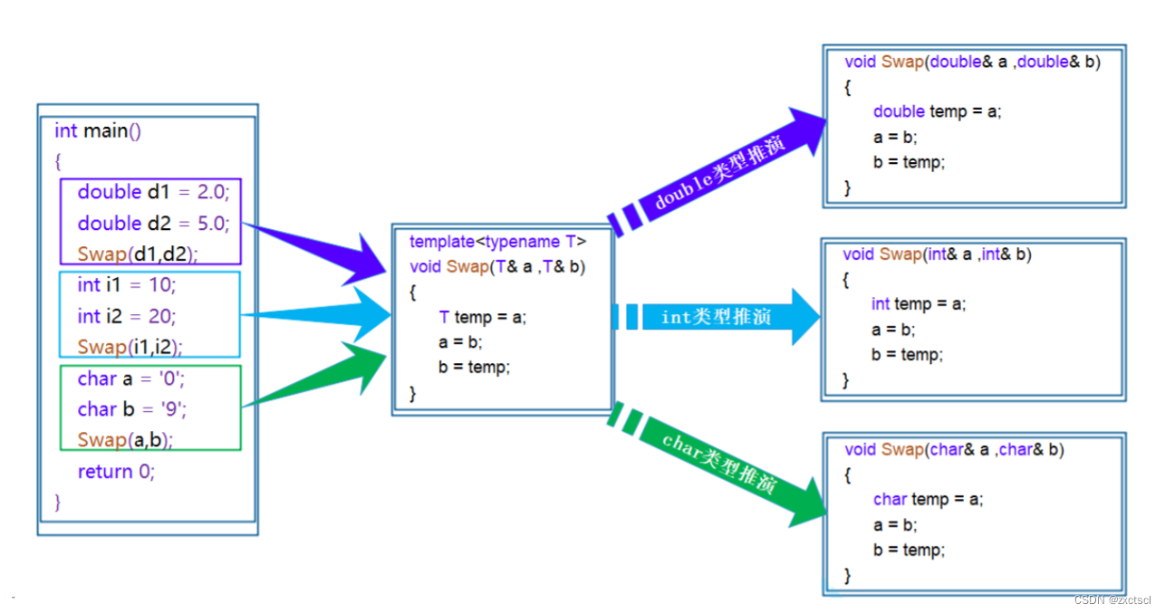 在编译器编译阶段,对于模板函数的使用,编译器需要根据传入的实参类型来推演生成对应类型的函数以供调用。 比如:当用double类型使用函数模板时,编译器通过对实参类型的推演,将T确定为double类型,然后产生一份专门处理double类型的代码,对于字符类型也是如此。