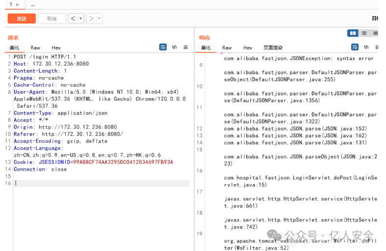 这个版本的Tomcat存在着文件包含漏洞,如果有上传点就可以实现文件包含进而达到RCE目的(之前一个靶场的思路)。但这里题目描述中提到了fastjson,我们抓一下它的包,内容只写一个{,如果是Fastjson,不完整的时候就会出现Fastjson