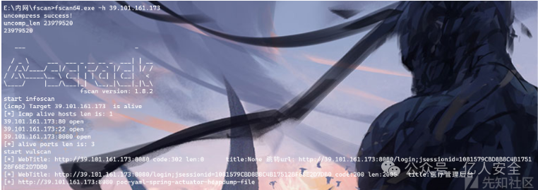 [*] WebTitle http://172.30.12.5:8080 code:302 len:0 title:None 跳转url: http://172.30.12.5:8080/login;jsessionid=A60E466BB515111EA9813AD488333B5B