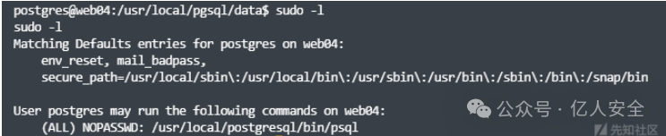 但是目前只是普通权限,需要进行提权,通过执行sudo -l发现psql