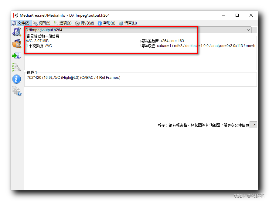使用 libx264 视频编解码器 重新 编码输出的 H.264 文件 的 视频信息 如下图所示 :
