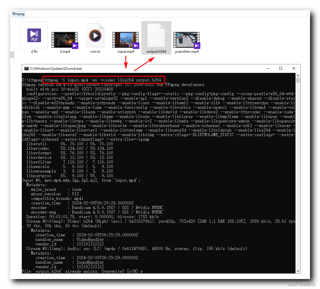 -i input.mp4 参数 : 指定了 输入文件为 input.mp4 视频文件 ;-an 参数 : 设置 ffmpeg 程序 提取 数据时 忽略 音频流 数据 , 只保留 视频流 数据 ;-vcodec libx264 参数 : 设置 ffmpeg 程序 提取 视频流 时 使用 libx264 视频编解码器进行重新编码操作 ;output.h264 参数 : 指定 提取后的视频数据 存放 的 输出文件 为 output.h264 ;命令执行过程 :