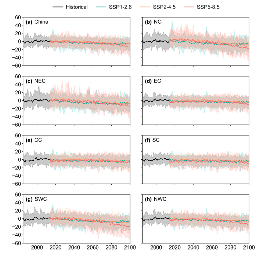 我国南部地区(华东、中部和南部地区)的风能密度变化幅度相对较低。在所有子区域中,华北地区可能会出现最大的风能密度减少,在 SSP5-8.5 情境下,到 2100 年可能达到 22.79% 。