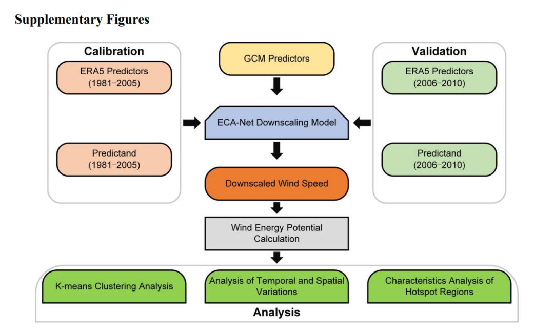 上图中,浅粉色框表示训练数据,浅绿色框表示验证数据,黄色框表示 GCM 数据,浅蓝色框表示 ECA-Net 降尺度模型,橙色框表示降尺度风速,灰色框表示风能潜力计算,绿色框表示在气候变化下风能潜力变化的分析。