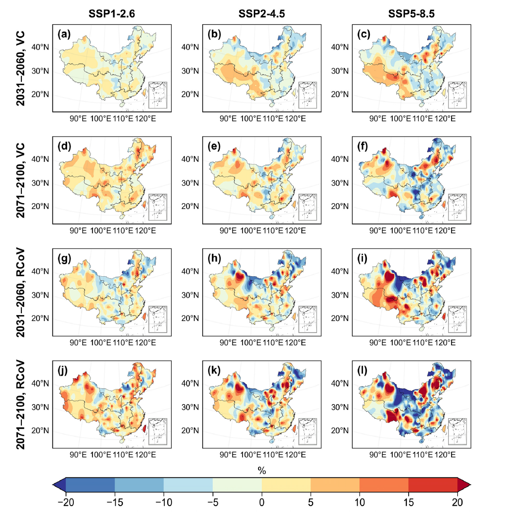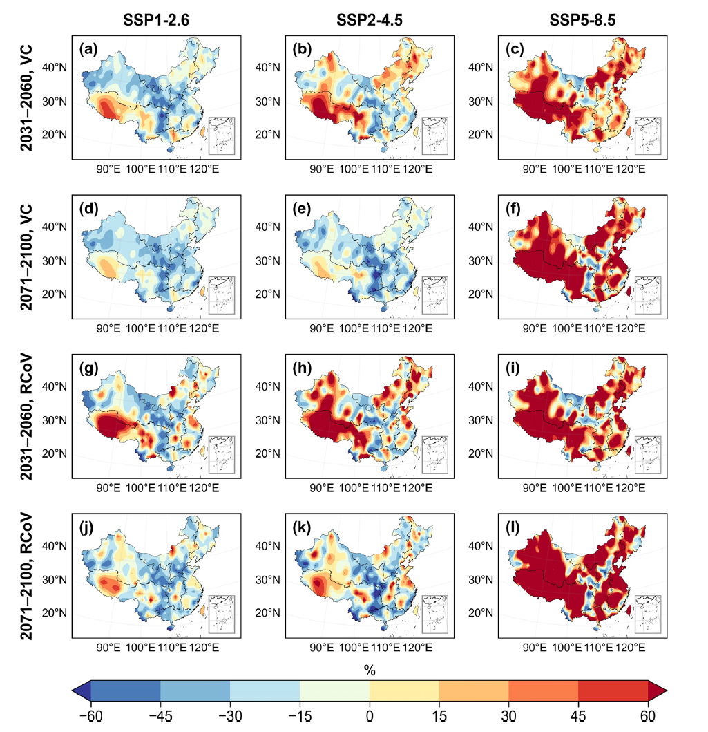 预计风能强度的增加将出现在相对较冷的月份,而在较高排放情境下的幅度更大。除了中世纪(2031-2060 年)在 SSP2-4.5 情境下,我国大部分地区的风能资源都将经历减少。
