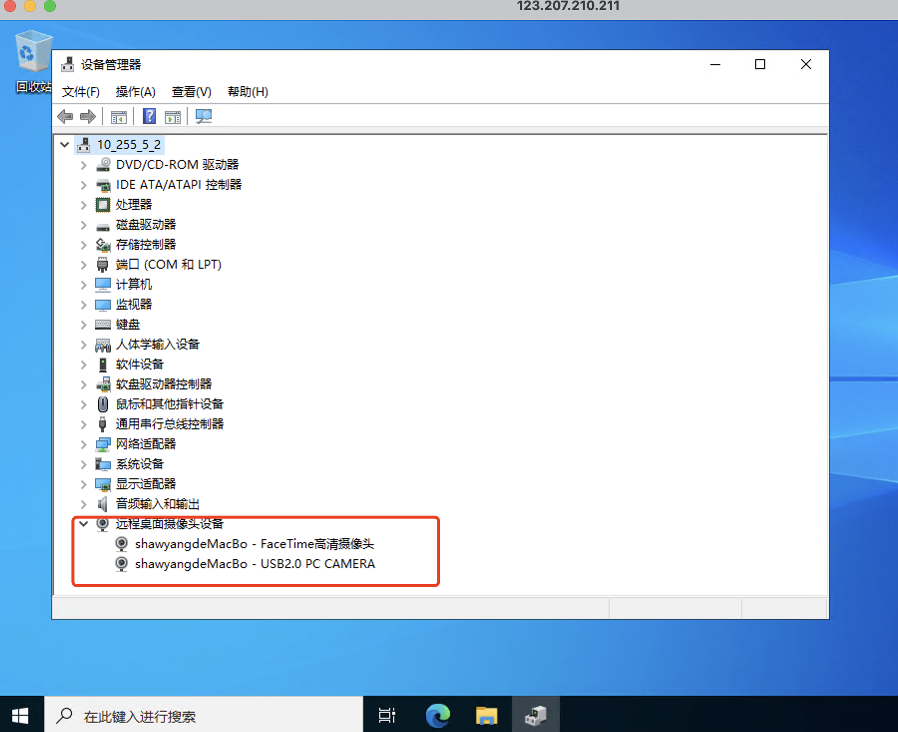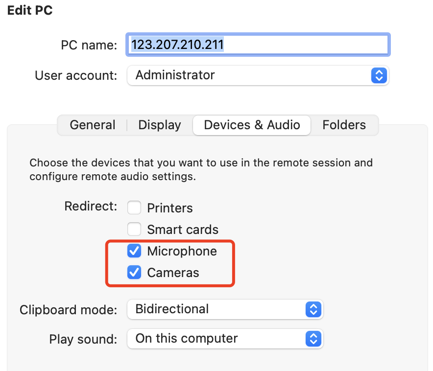 客户端无需额外配置,服务端参考https://cloud.tencent.com/document/product/213/43017 配置,使用microsoft-remote-desktop-for-mac 勾选如下图的Cameras就行。