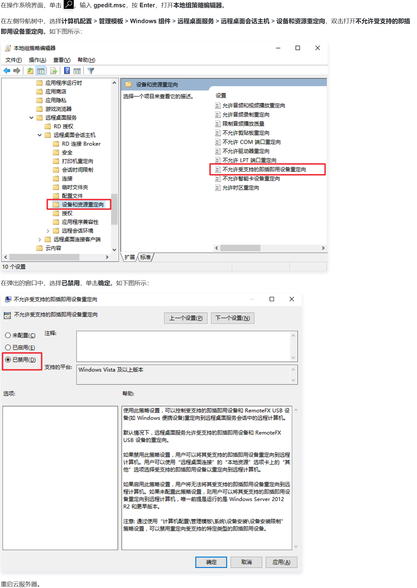 安装完成后打开组策略配置禁用"不允许受支持的即插即用设备重定向"