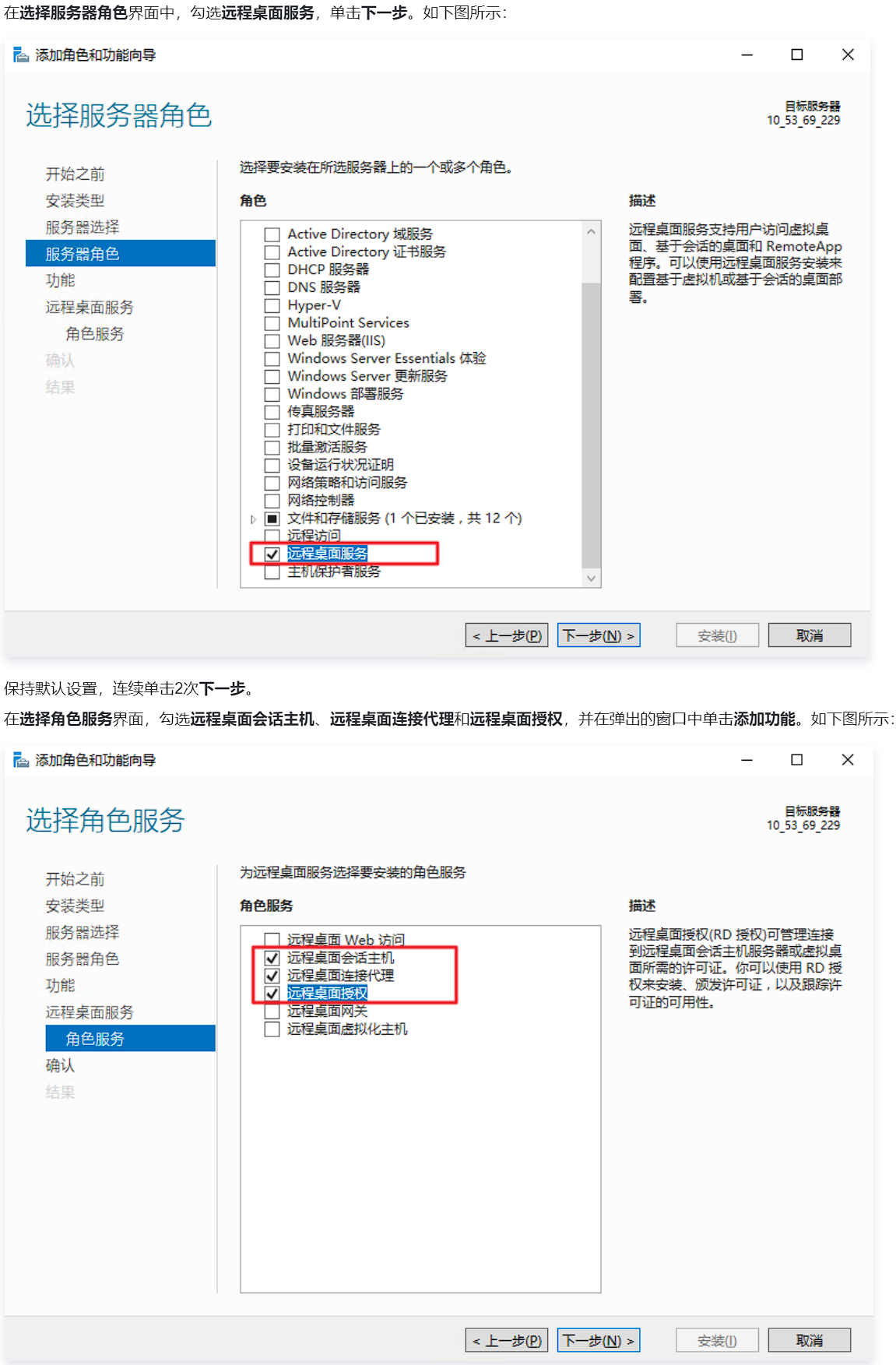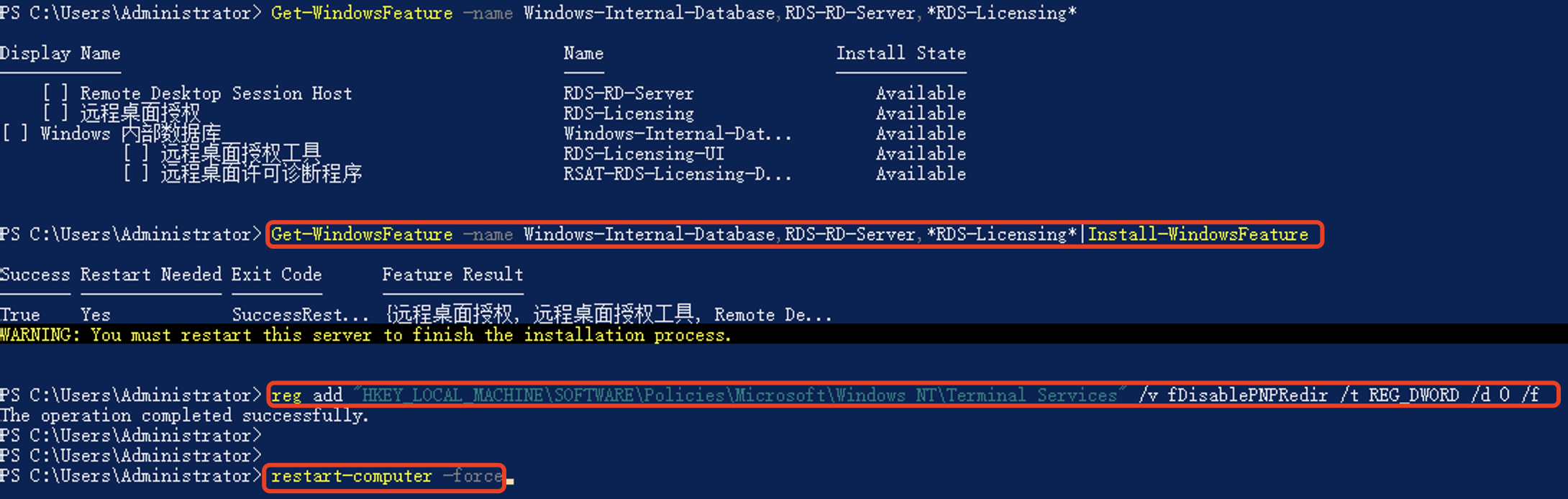下面两张截图上的操作,上面4句powershell命令搞定(勾选远程桌面会话主机、远程桌面连接代理、远程桌面授权→ 安装→ 重启服务器)