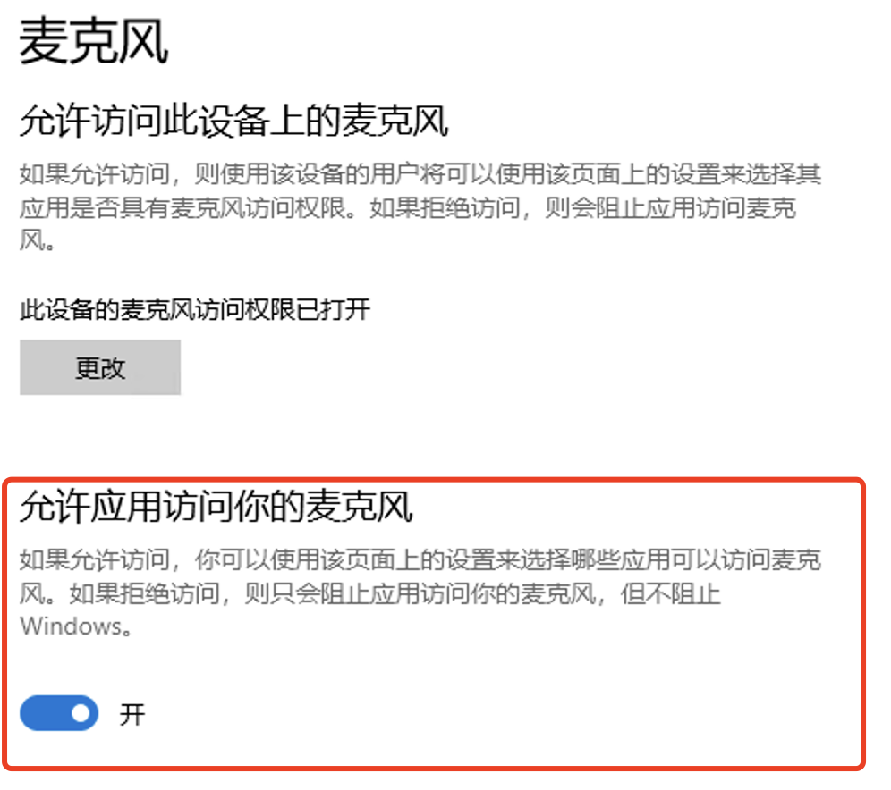录音权限:设置→系统→声音→麦克风隐私设置→允许访问此设备上的麦克风