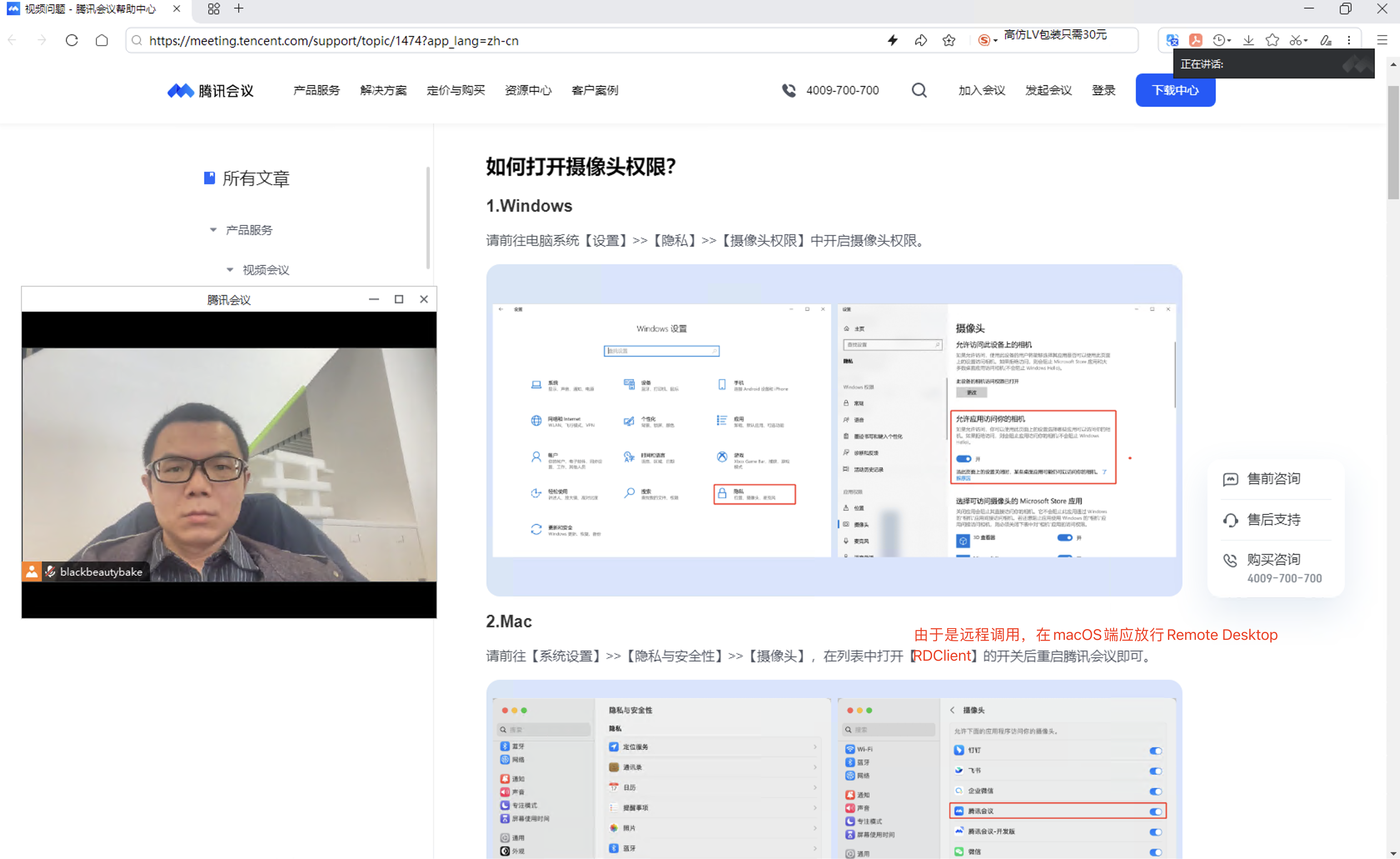 看到远程摄像头后还不算完,尤其要注意系统要打开录音权限、摄像头权限,都是在设置里