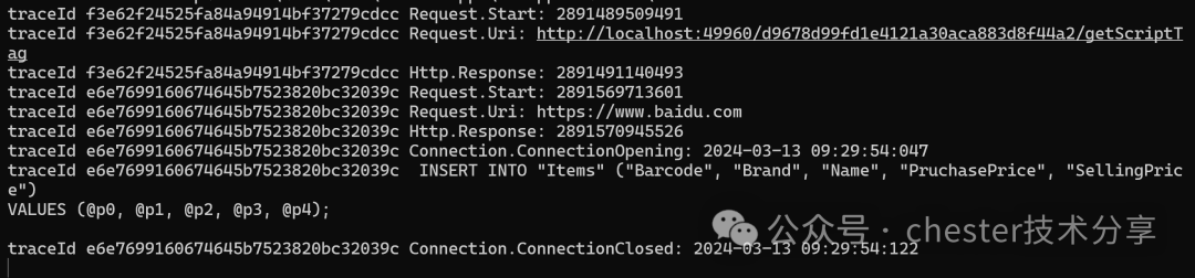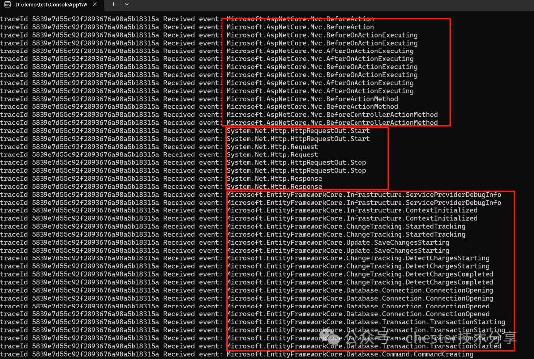 }再次启动,查看效果,可以看到已经获取到了http请求的开始结束事件,EF的查询语句,开始事件等。