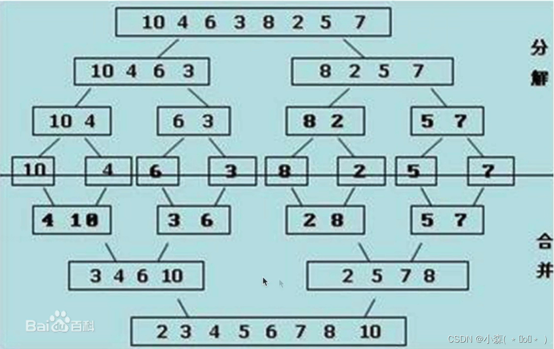 li[low:high+1]=ltmp对于一个数组,我们将其归并排序的步骤: