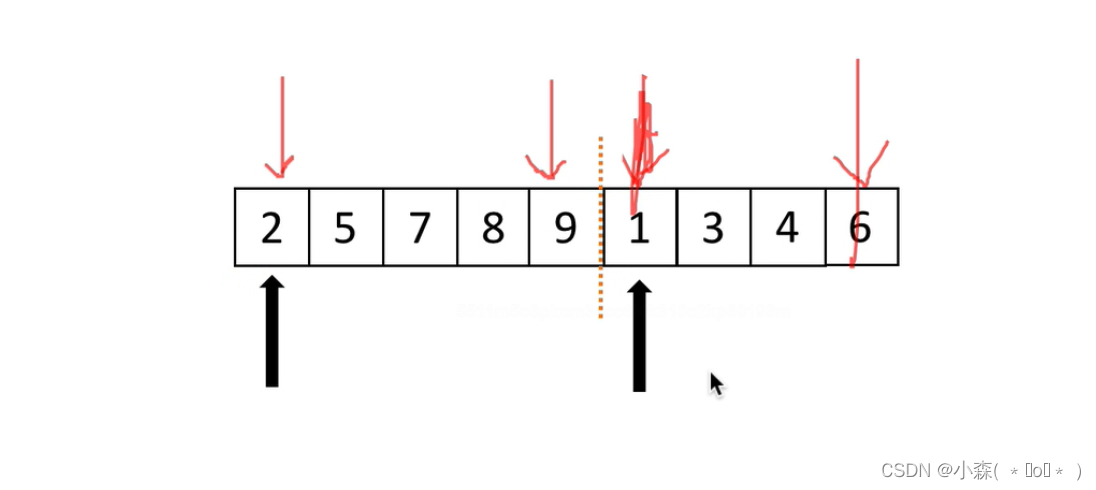 两个有序列表,有low指针指向2,high指针指向6,mid指针指向9