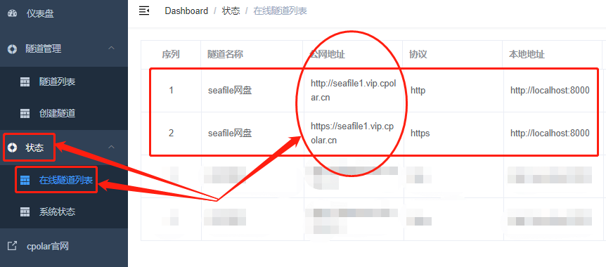 最后一步,我们点击cpolar客户端左侧状态——在线隧道列表,进入在线隧道列表页面,从这里获取能够连接本地seafile server的公共互联网访问地址。