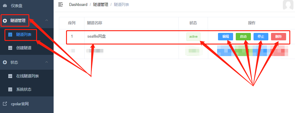 隧道创建完成后,cpolar会自动转入隧道管理——隧道列表页面,在这个页面我们能对已经创建的隧道进行管理,如启动、暂停、删除;如果需要对这条数据隧道的信息进行修改,也可以在这里点击编辑按钮,进入数据隧道信息修改页面。