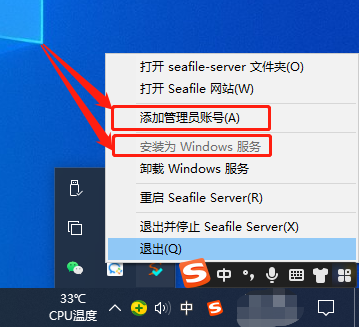 虽然seafile server已经安装完成,但此时seafile还缺少用户个管理员,并且还未开启Windows服务,因此我们右键托盘里的seafile server图表,选择安装为Windows服务和添加管理员账号选项。