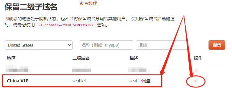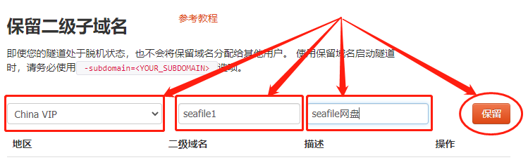地区:服务器所在区域,就近选择即可二级域名:会最终出现在生成的公共互联网地址中,作为网络地址的标识之一描述:可以看做这条数据隧道的描述,能够与其他隧道区分开即可)完成这几项设置后,就可以点击右侧的保留按钮,将这条数据隧道保留下来。