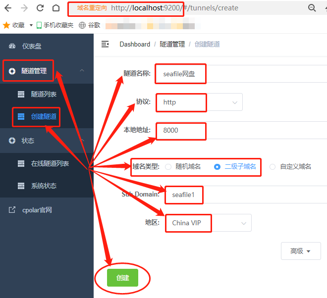 完成cpolar客户端创建隧道所需信息的填写后,就可以点击页面下方的创建按钮,完成穿透本地局域网的数据隧道,让我们能在公共互联网上访问到本地seafile server。