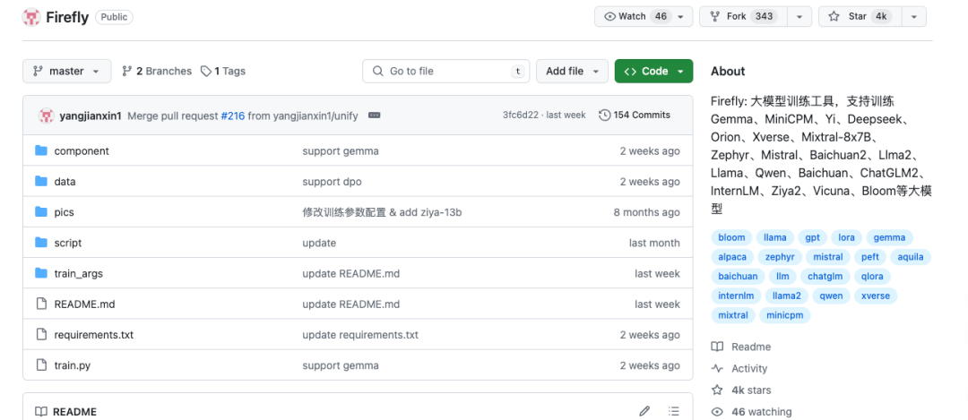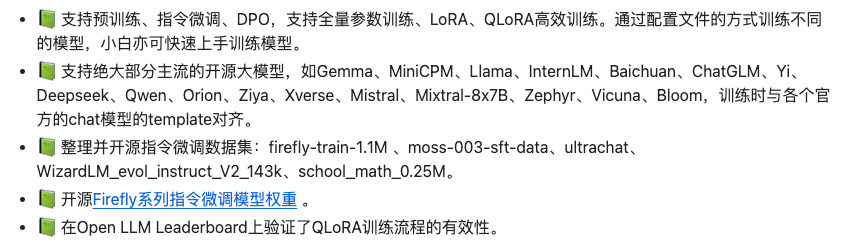 作为一个开源项目,Firefly支持对多种主流大模型进行预训练、指令微调和DPO。