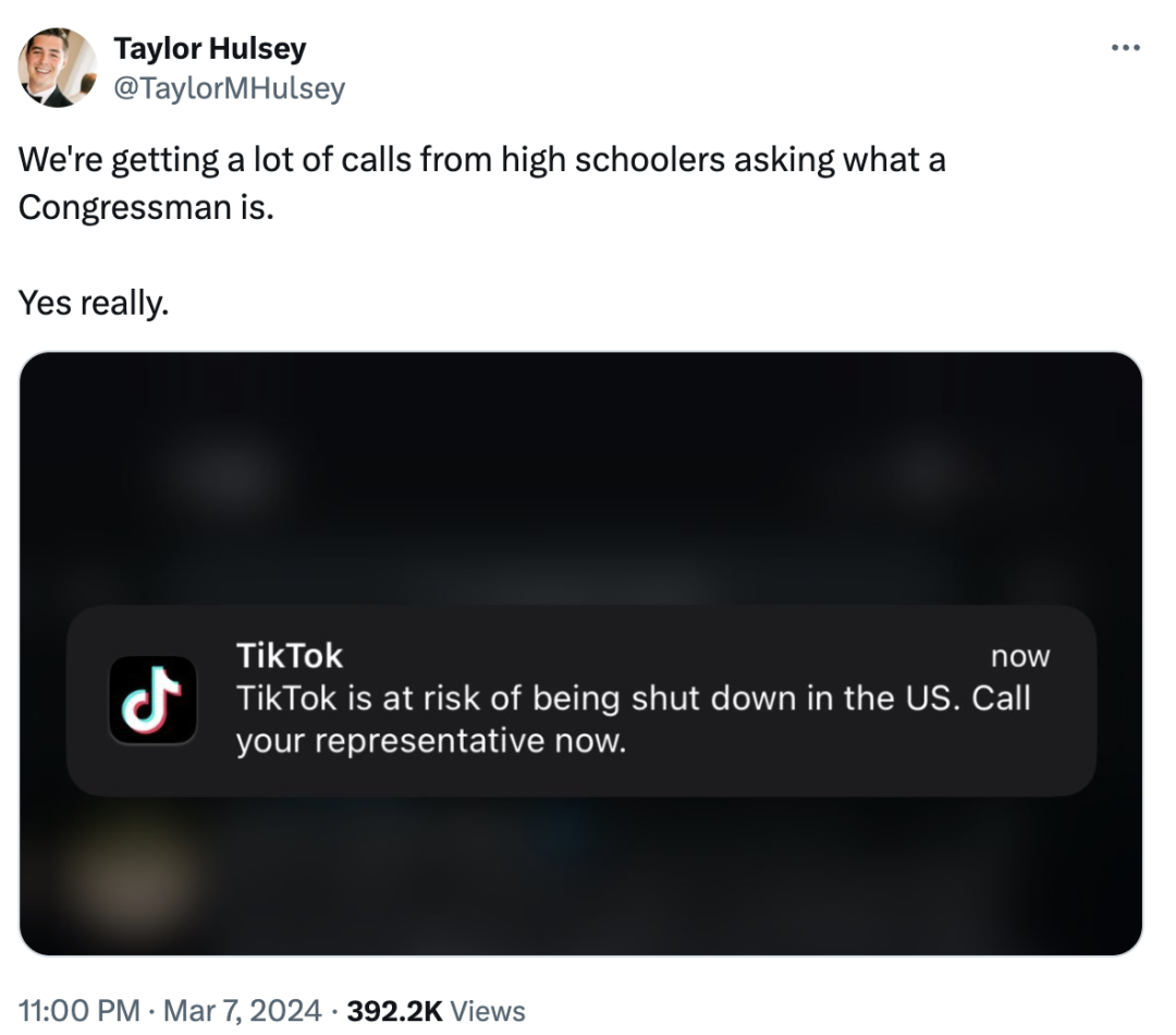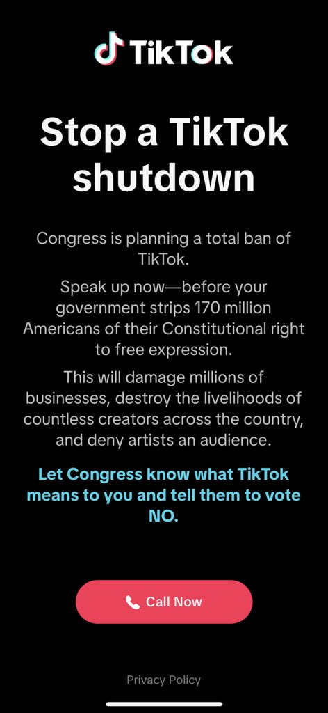 “国会正在计划全面禁止 TikTok。” “在你们的政府剥夺 1.7 亿美国人言论自由的宪法权利之前,现在就大声说出来吧。这个计划将损害数以百万计的企业、摧毁全国无数创作者的生计,并剥夺艺术家的观众。让国会知道 TikTok 对你并告诉他们投反对票。”