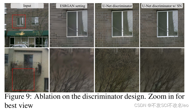 U-Net和更复杂的退化都加大了训练的不稳定性。为缓解该问题,论文采用SN(spectral normalization)正则项约束判别器让其网络参数变动在一个范围内从而稳定判别器的训练。论文也发现,SN还有助于由gan产生的过锐和artifacts问题。通过这些设置,论文实现了局部细节增强和artifacts压制的一种平衡。这些设置包含了两方面:1. U-Net的结构;2. SN的约束。其实都是在说判别器更好的话生成器生成的结果更好。
