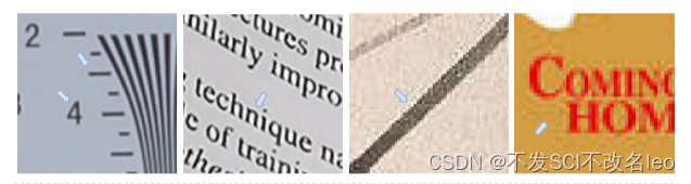 从前两幅图中可以看到文字或者线条周围的百变,后两幅图中可以看到线条核文字周围的噪点。锐化容易使高频信息周围产生振铃artifacts(白边),JPEG压缩产生了过冲artifacts(跳跃的噪点)