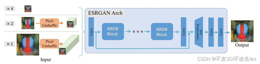 网络结构上采用ESRGAN相同的生成器(由RRDB模块构成),同时除了支持4倍超分还扩展到2倍和1倍超分。在x2和x1设置下,先采用pixel unshuffle来降低输入的空间尺度(扩大了通道数量)。将pixel unshuffle后的结果再送入ESRGAN网络中。这样可以减少GPU内存和计算机资源的消耗。