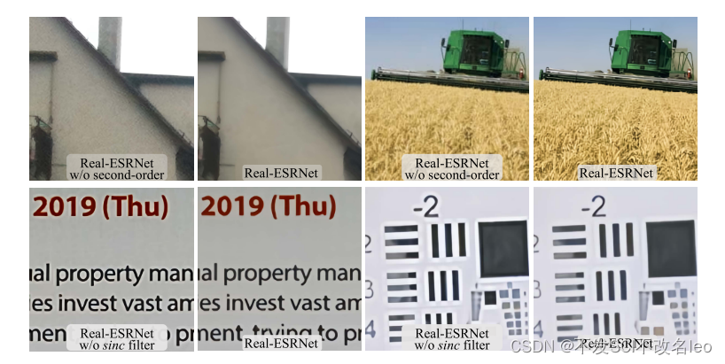 上图:包含和不包含二级降解过程的Real-ESRNet结果。下图:带和不带sinc过滤器的Real-ESRNet结果。放大以获得最佳视图