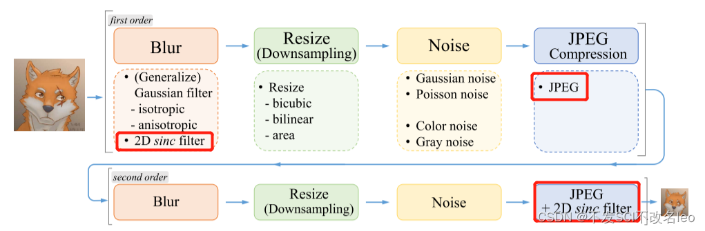 基于上述退化,Real-ESRGAN提出扩展经典的“一阶”退化模型(“一阶”退化是经典的退化模型)为“高阶”退化模型。“高阶”退化就是进行多次“一阶”退化。第一次“一阶”退化的结果是第二次“一阶”退化的输入。由此,论文期望通过”高阶“退化可以得到和真实退化更接近的LR数据。