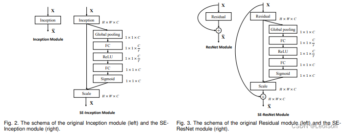 SE模块的灵活性在于它可以直接应用到现有的网络结构中。以Inception和Resnet为例。对于Inception网络,没有残差结构,这里对整个Inception模块应用SE模块。对于Resnet,SE模块嵌入到残差结构的残差学习分支中。具体如下图所示: