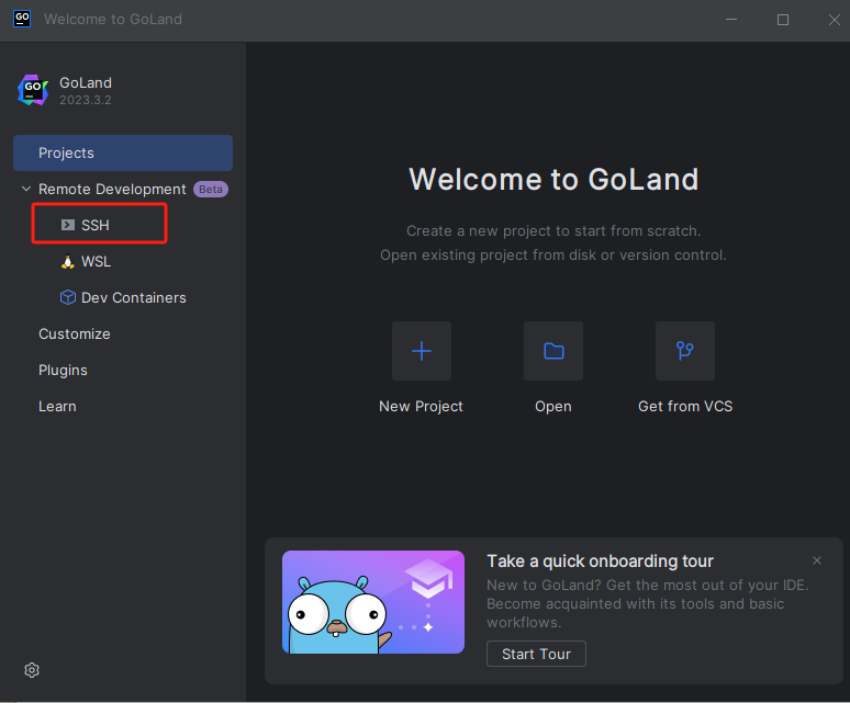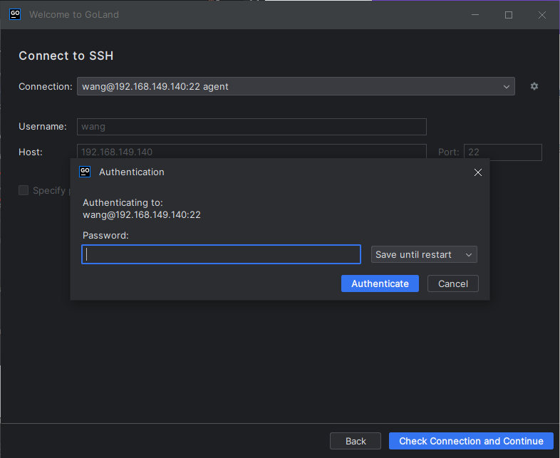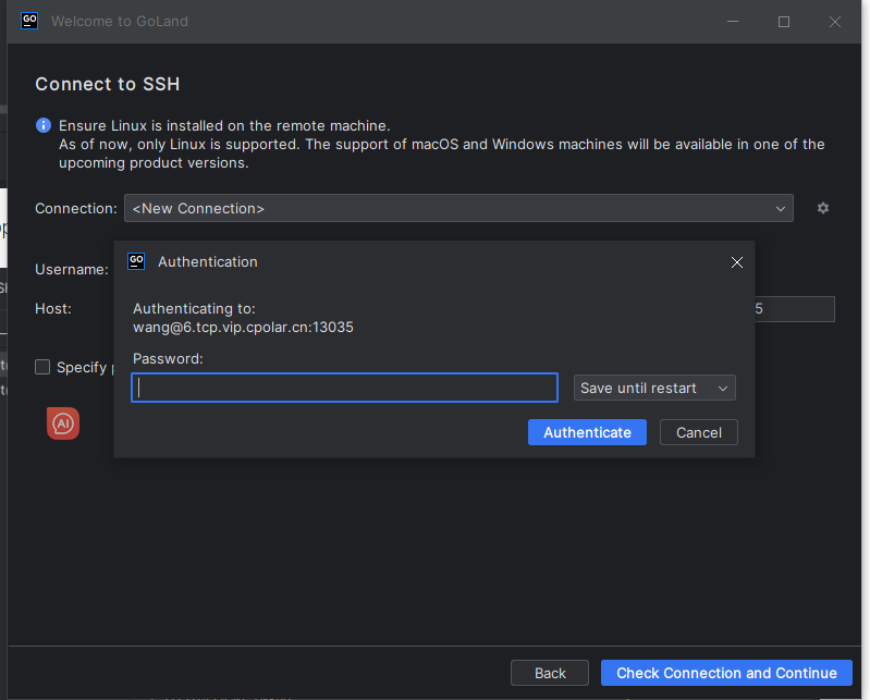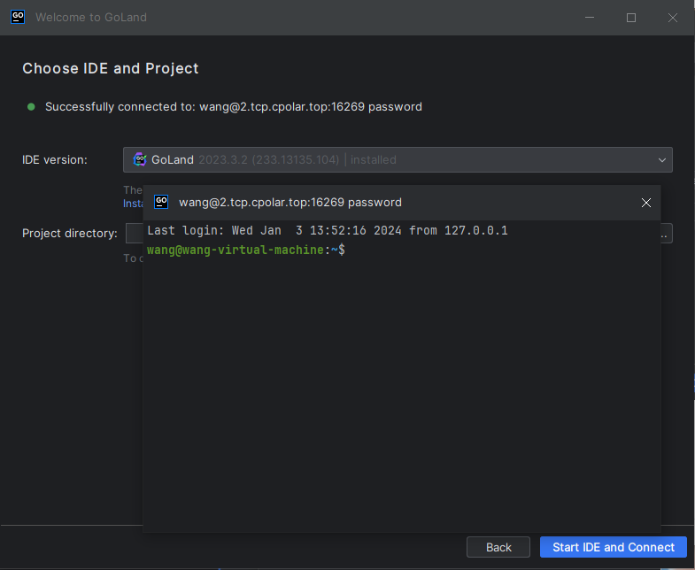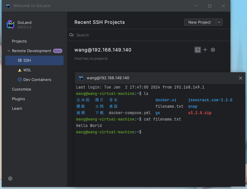 在GoLand中点击New Project,填写Username和Host(Username指服务器端用户名,Host为刚才获取的服务器本地IP地址)