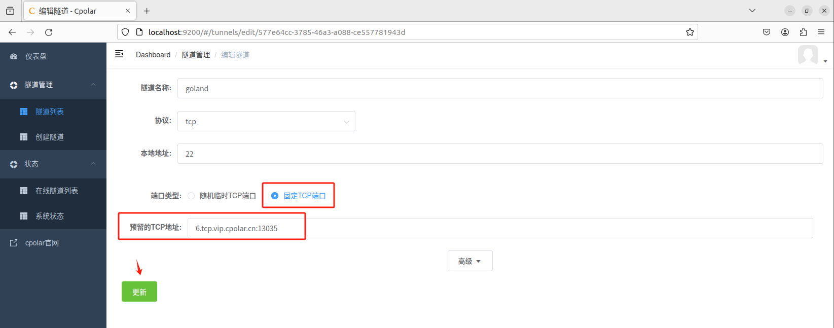 修改隧道信息,将保留成功的固定tcp地址配置到隧道中