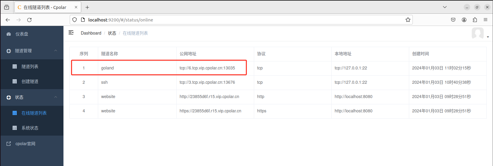 隧道更新成功后,点击左侧仪表盘的状态——在线隧道列表,可以看到公网地址已经更新成为了固定TCP地址。